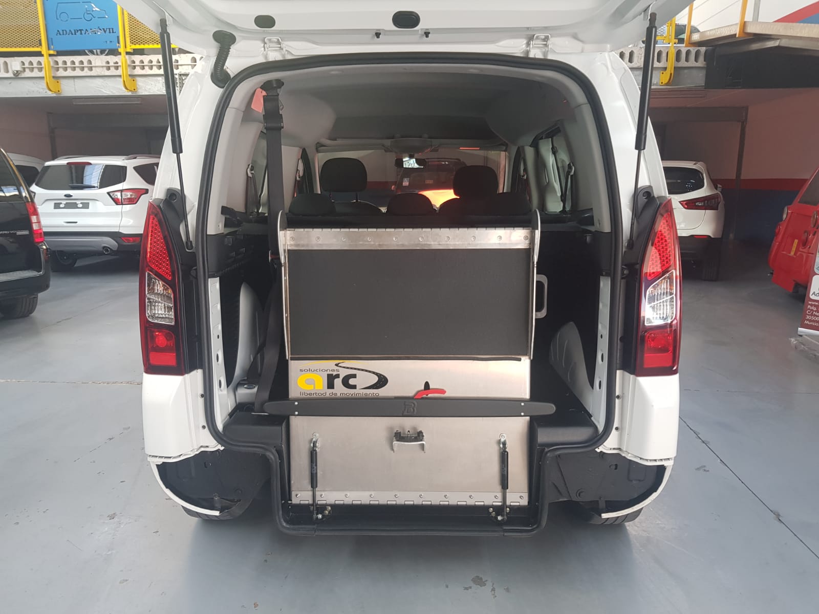 Rebaje de piso en la parte trasera e instalacion de rampa manual y guias con anclajes para la silla de ruedas. El tipo de adaptacion permite que la persona discapacitada quede totalmente integrada con un asiento a cada lado. Plazas finales: 3 plazas más 1 silla de ruedas o 5 asientos. El vehículo se entrega revisado, transferido, homologado y 1 año de garantía.